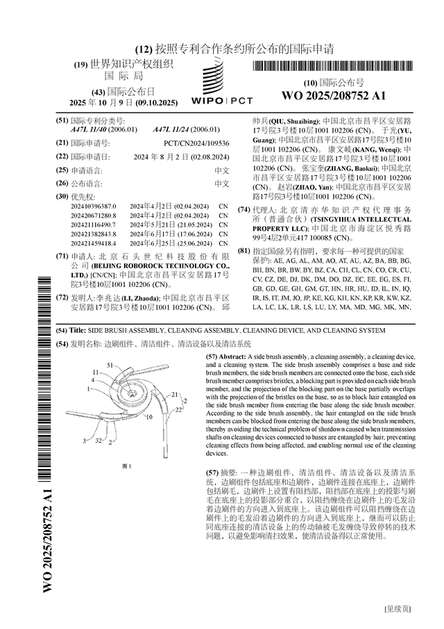 证券之星消息,根据企查查数据显示石头科技(688169)公布了一项国际专利申请,专利名为“边刷组件、清洁组件、清洁设备以及清洁系统”,专利申请号为PCT/CN2024/109536,国际公布日为2025年10月9日。